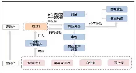 REITS对于商业地产企业运营模式最大的影响在于其提供了一种推出机制。商业地产企业首先进行以自有资金和信贷融资获得的资金进行商业地产的开发以及前期培育,等商业地产培育成熟获得稳定的租金收入后将成熟的存量资产打包设立REITS在公开市场出售部分份额回笼资金,本质上是一种类住宅开发模式,提高了IRR,缩短了投资回报周期,同时房企持有部分REITS份额享受每年的分红收益以及潜在的物业升值收益,整个过程实现了由重资产向轻资产的转变。